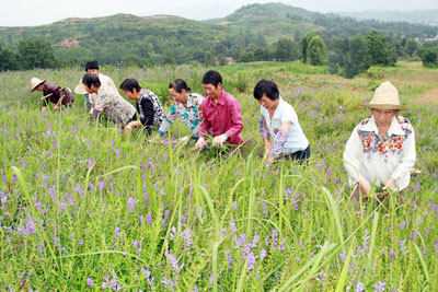 日前,房县神农本草有限公司军店镇三溪沟药材基地的工人们正在为黄芩除草。近年来,该公司大力发展中药材产业,目前,公司已自办发展药材2万亩,通过定单发展药材8万亩,年收入1.78万元;带动了2980多户药农致富,仅此一项,药农户平增收1万多元。(赵爱平 张德福 摄)