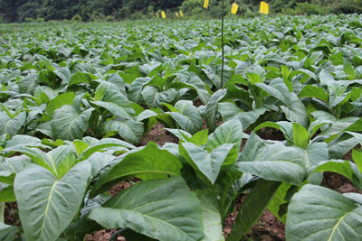 11日,笔者在青峰镇卧牛观村看到,烟田里的烟叶长势喜人(右图)。据统计,今年我县在九道、上龛、青峰、万峪、土城等10个乡镇1680户发展烟叶4.132万亩,预计可产烟叶10万担。 (程培武 摄)