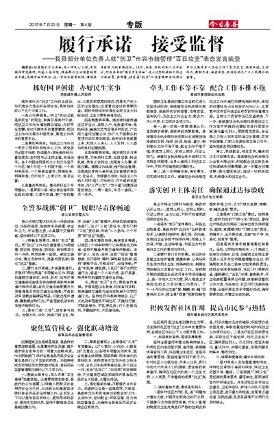 编者按:创建国家卫生县城,是一项民心工程,是实践科学发展观,改善人居环境、提高群众生活质量的有效手段;是提升城市品位、进一步优化投资环境、增强县域软实力的重要途径。18日,县委、县政府专门召开会议,对我县争创“国家卫生县城” 进入攻坚阶段的工作进行再动员、再部署,担负着“创卫”工作重要职责的部分单位主要负责人在会上作了表态发言,郑重承诺,主动作为,履职尽责,接受县委县政府检阅及广大人民群众的监督 。