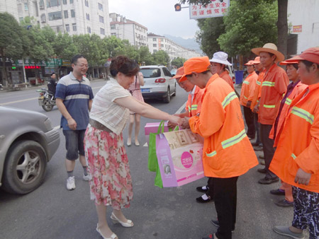 连日来,房县持续高温,很多人都在空调房里享受清凉,而环卫工人却坚守在一线,为清洁美化城市而不懈努力。近日,县总工会主席刘玉萍一行带着清凉饮料和防暑物品来到街头,慰问奋战在高温一线的环卫工人,对他们在创卫工作中的无私奉献表示感谢。(张力 杨小微 摄)