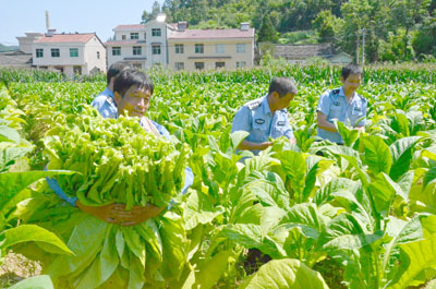 近日,县公安局基层派出所民警克服高温天气,抽出时间,下地义务帮助农民打收烟叶,受到群众的欢迎和称赞。图为土城派出所民警正在帮助农民打烟叶。 (魏世银 摄)