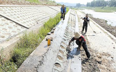 日前,技术人员正在马栏河张家湾段除险加固河堤。2012年以来,我县分年度、分段对县城河堤进行除险加固。目前,全县已加固县城河堤44公里。(孙淑芬 张华军 摄)
