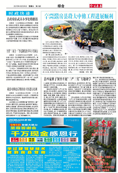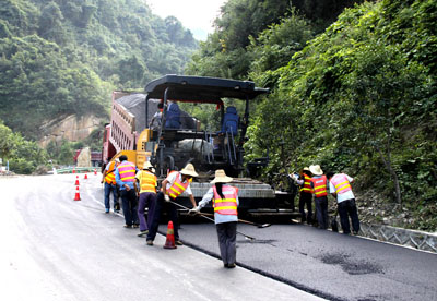 据了解,备受沿线群众关注的209国道畅安舒美示范工程及六两路、十两路大中修工程自七月初开工以来,施工单位精心组织施工、统筹安排人机物资源配置,狠抓施工安全质量,严格现场过程控制,各项建设正快速推进。截至目前,六两路房县段大修完成挡土墙4000立方米,水稳基层12公里,沥青砼下面层8公里,沥青砼上面层7公里,钢护栏4公里;十两路房县段中修完成沉陷坑槽处理4000平方米,沥青砼上面层5公里,浆砌边沟10公里,整个工程将在九月底全面竣工。图一为十两路柳树垭路段沥青路面摊铺,图二为十两路中修修补坑槽,图三为对各个路段进行重新划线工作。 (吴宏强 王东 摄)