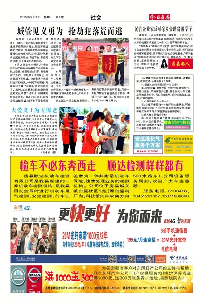 本报讯 (通讯员张力 邱浩) 日前,一名在银行取钱的女士遭遇歹徒跟踪并抢劫,就在歹徒逃跑的过程中,房县城管执法局城乡管理综合执法大队三中队副中队长肖正超挺身而出,穷追不舍,歹徒无计可施,丢下现金后落荒而逃。
