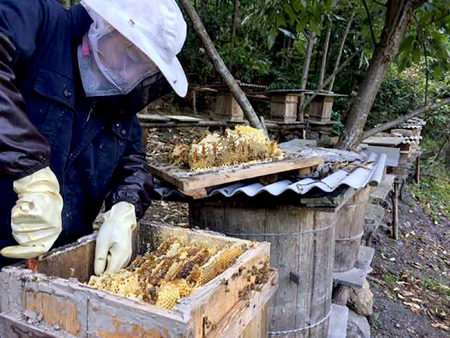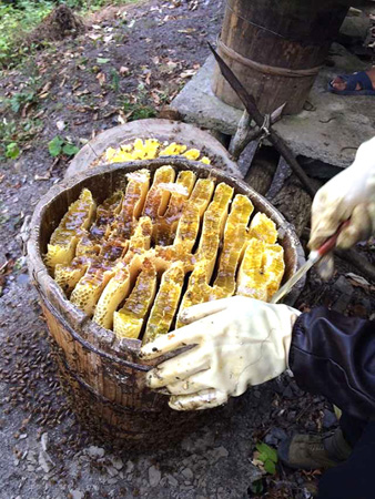 10日,上龛乡蜂农正在采割蜂蜜。今年来,上龛乡投资10万元制作并免费发放蜂箱1000个,组建蜂蜜专业合作社 ,出台奖励政策,刺激蜂产业壮大,全乡蜂农达500户,养殖高山野生土蜂达6000箱,目前蜂蜜逐渐进入采收期。 (陈俊 摄)
