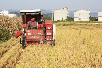 15日,城关镇莲花村村民许世清雇佣的收割机正在稻田里来回作业,抢收熟透的稻谷。今年我县抓早抓实,积极主动抓好粮食生产,全面落实中央对种粮农民补贴政策,发放粮食直补资金316.2万元,农资综合补贴2565.1万元,良种补贴626.7万元,大大调动了广大农民种粮的积极性,全县水稻栽插面积达12万亩。目前,各地水稻陆续进入收获期。(陈锐 刘林 摄)
