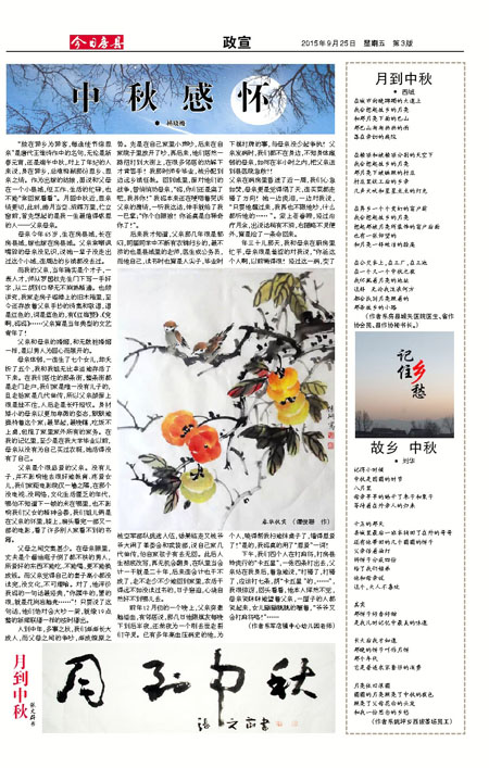 “独在异乡为异客,每逢佳节倍思亲”是唐代王维诗作中的名句,无伦是新春元宵,还是端午中秋,对上了年纪的人来说,身在异乡,总难抑制那份思乡、思亲之情。作为出嫁的姑娘,虽说和父母在一个小县城,但工作、生活的忙碌,也不能“常回家看看”。月圆中秋近,思亲情更切,此刻,皓月当空、清辉万里,伫立窗前,首先想起的是我一生最值得感恩的人——父亲母亲。