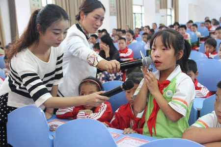 每逢佳节倍思亲。近日,东城小学组织304名留守儿童开展了以“关爱无处不在”为主题的关爱留守儿童系列活动。该校通过师生齐唱《留守儿童之歌》、贴亲情树、发放爱心月饼、电话连线、表彰优秀留守儿童、教师寄语等一系列活动的开展,让留守儿童感受到老师和同学们对他们的浓浓的关爱。图为留守儿童刘雨欣与爸爸妈妈通电话。(李英 摄)