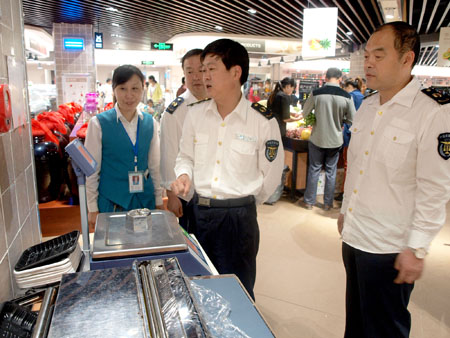 29日,县质监局执法人员正在寿康永乐生活广场开展“公平计量”检查(右图)。为营造诚信、公平的购物环境和市场秩序,保障消费者的合法权益,县质监局开展“公平计量”专项检查,严厉打击缺斤短两、欺诈消费者的不法行为,确保群众过一个快乐的十一黄金周。(邹俊毅 摄)