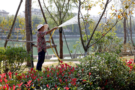 近日,绿化人员在为半岛湾生态休闲公园新栽植的绿化树木浇水。城区绿化作为绿满房县“三区”绿化的一个重点绿化项目,县林业局采取增绿提质、连通绿化带、建设林荫路、补充道路绿化来提高城区绿化率。目前城区植被覆盖率、绿地率分别达到45.6%、38.7%,人均公园绿地面积10.3平方米。
