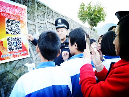 3日下午,一场别开生面的消防安全宣传活动在姚坪乡中心学校进行,该校师生拿出手机通过扫县公安局官方微博、微信“平安房县”二维码了解消防知识。