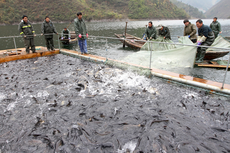 1日,三里坪渔业发展有限责任公司天然养殖的鳙鱼、白链销往四川、重庆市场。房县三里坪渔业发展有限责任公司,依托汉江支流南河三里坪水库2.5万亩水域,实施天然养殖花白鲢、青鱼等12个优质水产品种。由于水库水质达到国家一级标准,依靠天然养殖且不投放任何添加剂的鱼饵料,年均上市的1200吨纯天然无公害商品鱼,畅销四川、湖南、河南等5个省1个直辖市,实现产销两旺,盈利逐年攀升。(余竟 张华军 摄)