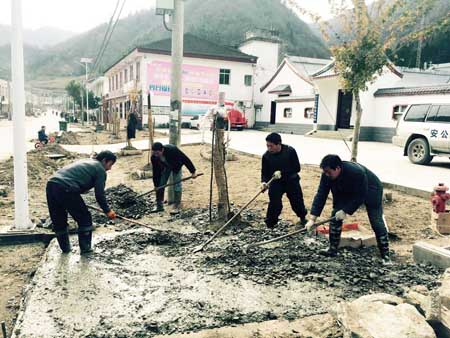 日前,上龛乡自筹资金40余万元,对集镇集中栽植84棵香樟树,硬化人行道、铺设综合管沟盖板1.2千米。图为施工现场。 (陈俊 刘丹 摄)