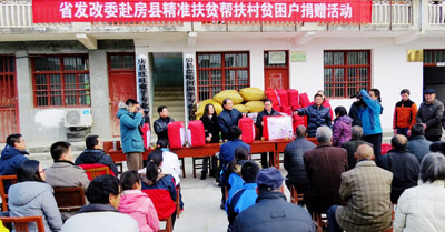 24日,省发改委副主任王光耀带队来到军店中村村开展扶贫捐赠帮扶活动。在活动仪式上,省发改委为孤寡老人和贫困户捐赠棉被40床、衣物300件(套),为中村村小学全体学生赠书包和学习用具120件(套)。同时确立了由省发改委领导和职工个人资助认领结对帮扶贫困生6名。 (刘智宝 摄)