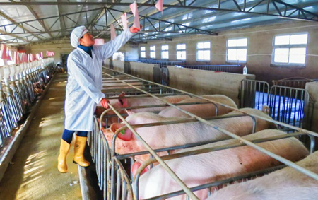 日前,房县军店镇官桥牲猪养殖专业合作社社长何苹正在查看牲猪配料情况。该社现常年存栏牲猪1000头,年销售肥猪5000头,社员户平增收600多元。(刘智宝 摄)