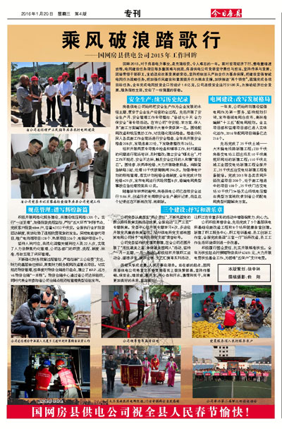 回眸2015,对于房县电力事业,是充满收获、令人难忘的一年。面对宏观经济下行、售电量增速放缓、电网建设任务艰巨等多重困难与挑战,房县供电公司党委坚守责任与担当、坚持传承与发展,团结带领干部职工,主动适应改革发展新常态,坚持把依法从严治企作为基本保障,把建设坚强智能电网作为战略任务,把加强作风建设和素质提升作为根本支撑,加快推进“两个转变”,圆满完成各项目标任务,全年完成电网投资全口径统计1.6亿元,公司连续安全运行5186天,为推动经济社会发展、服务百姓生活,交出了一份满意的答卷。