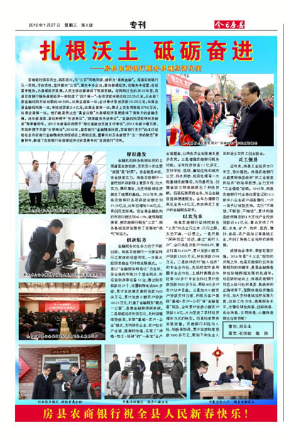 农商银行因农而生,因农而兴,与“三农”同根同源,被称为“草根金融”。房县农商银行从一而终,不改农姓,坚持面向“三农”、面向中小企业、面向县域经济,在服务中经营,在经营中服务,为县域经济发展、人民生活改善做出了积极贡献。在刚刚过去的2015年里,房县农商银行服务县域经济一举创造了“四个第一”:各项贷款余额达到32.35亿元,占全县7家金融机构市场份额的48.59%,位居全县第一位;全计累计发放贷款14.35亿元,位居全县金融机构第一位;净投放贷款5.4亿元,位居全县第一位;累计上交各项税收3708万元,位居全县第一位。他们就是用这些“真金白银”为县域经济发展提供了强有力的金融支撑。连年被县委、县政府授予“先进单位”、“财源建设先进单位”、“金融机构贷款特别贡献奖”等荣誉称号。2013年被省政府授予“湖北省就业先进工作单位”;2014年被十堰市委、市政府授予市级“文明单位”;2015年,县农商行“金融精准扶贫,农商银行先行”的工作经验在全市农商行金融精准扶贫现场会上得到交流,董事长刘玉山被授予“五一劳动模范”荣誉称号,彰显了农商银行在县域经济社会发展中的“主流银行”作用。