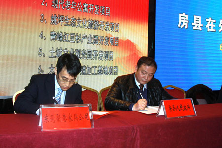 县委常委、副县长高明哲代表县政府与东莞聚意家具有限公司总经理余行兵签订现代老年公寓开发项目投资协议