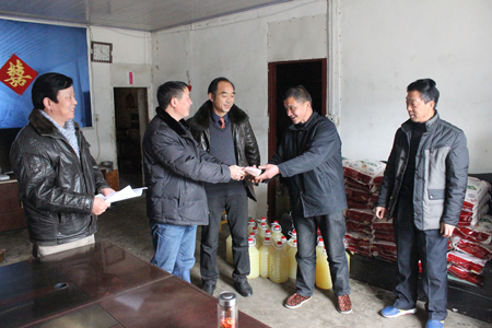 在堤坪村村委会,县粮食局还将自己联合部分企业共同筹集的7万元村集体发展资金送到村干部手中,用于支持堤坪村新一年的村级建设。 (陈锐 摄)