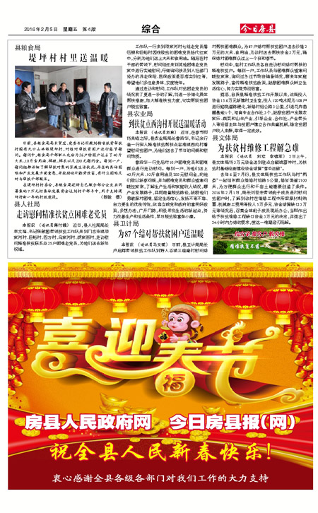 本报讯 (通讯员马文斌) 日前,县卫计局局长卢启辉带领扶贫工作队到野人谷镇三座庵村慰问结对帮扶困难群众,为87户结对帮扶贫困户送去价值2万元的大米、食用油,为该村送去帮扶资金3万元,确保结对困难群众过上一个祥和春节。