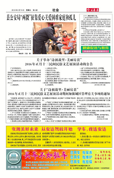 “诗祖故里·美丽房县”2016年正月十三民间民俗文艺展演将于2016年2月20日在房县城区举行(以下简称“文艺展演”)。根据《中华人民共和国治安管理处罚法》、国务院《大型群众性活动安全管理条例》等法律法规的规定,为确保“大巡游”安全顺利举行,保障人民群众生命财产安全,维护社会秩序,决定对“文艺展演”活动现场加强社会管理。现通告如下: