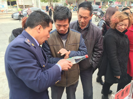 化龙工商分局向群众介绍假冒产品鉴别和消费维权知识。(喻传宏 段敬垚 摄)