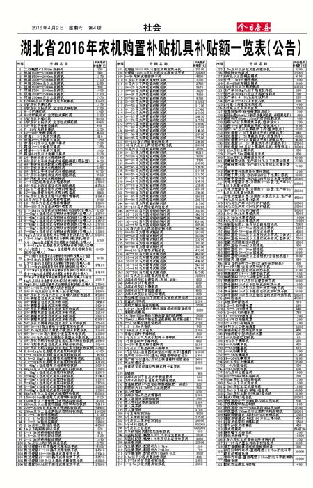 湖北省2016年农机购置补贴机具补贴额一览表(公告)