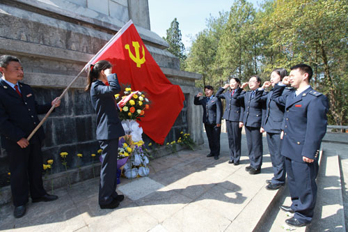 县国税局组织青年党员代表在烈士纪念碑前,重温入党誓词;县公安局部分干警为二级英模、原县公安局干警陈士欣烈士扫墓。(赵爱平 余清湖 张德福 摄)