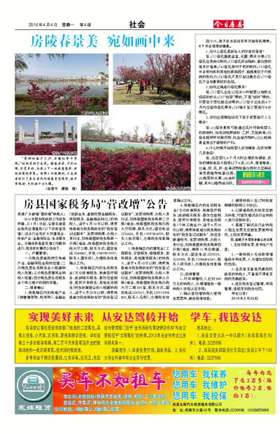 “草树知春不久归,百般红紫斗芳菲。”说的是四月美景。暖春房县,万木吐绿,百花齐放,全县上下一派春意盎然、欣欣向荣的景象。清明小长假期间,大美房县吸引了来自县内外游客赏花观景,城市景观游、乡村游十分火爆。(赵爱平 谭傲 摄)
