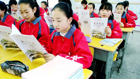 15日上午,县实验中学七年级的学生正在诵读国学经典。为传承弘扬中华优秀传统文化,培育社会主义核心价值观,县实验中学多措并举,掀起了诵读经典活动的热潮。今春开学后,该校学生人手一册《朝读经典》课本到手,全校各班每天晨读20分钟,通过试读、领读、齐读、互读、试背、齐背等方式积累经典内容,领悟经典要义。今后,该校还将分年级开展朝读经典竞赛活动。 (曹刚 陈文姣 摄)