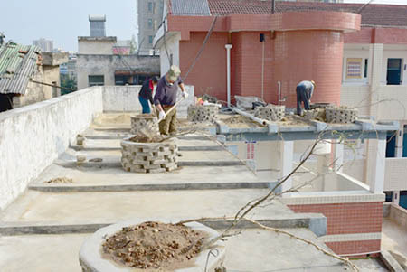 近日,在县实验小学教学楼南、北走廊的楼顶,施工人员正在建造一个个小型“花园”。