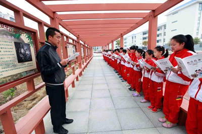 4月19日上午朝读时间,县东城小学师生正在朝读《诗经》。该校将诵读《诗经》内容有机渗透、融入到学科教学之中,引导学生亲近经典,通过经典诵读比赛、师生共读经典、亲子诵读等形式,让优秀的诗经文化潜移默化地滋养学生心灵。 (赵爱平 李英 摄)