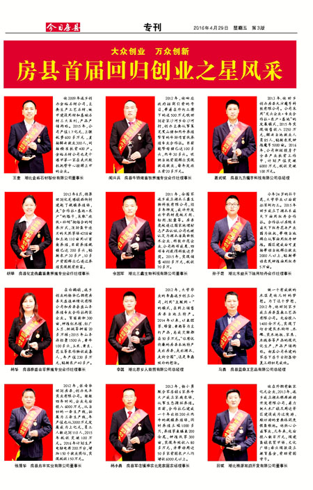 他2009年返乡创办金裕石材公司,主要生产工艺石材、城市建设用材和基础石材三大系列,产品产销两旺。2015年,公司产值1.7亿元,上缴税费600多万元 ,直接解决就业300人,间接精准扶贫400户。金裕石材公司也是十堰市第一家在武汉股权托管中心挂牌上市的企业。
