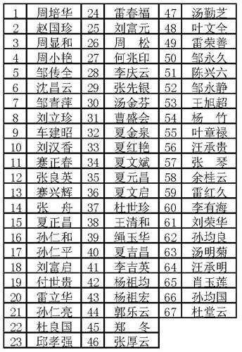 根据《湖北省人民政府关于被征地农民参加基本养老保险的指导意见》(鄂政发〔2014〕53号)、《湖北省被征地农民养老保险补偿实施细则》(鄂人社发〔2015〕2号)、《房县人民政府办公室关于转发<十堰市被征地农民参加基本养老保险实施办法>的通知》(房政办发〔2015〕70 号)文件规定,经城关镇人民政府、县公安局、经管局、国土资源局对三甲医院征地项目67名符合享受基本养老保险补偿对象的确认核实,县城乡居民社会养老保险局按经办规程对享受对象补偿标准进行测算,拟为其办理被征地农民参加基本养老保险参保手续。为了加强对我县被征地农民养老保险参保人员资格的民主监督,现将周培华等67名符合享受被征地农民养老保险补偿对象予以公示,公示时间为7天(2016年5月12日至2016年5月18日),欢迎广大群众对公示人员信息的真实性、准确性举报监督。