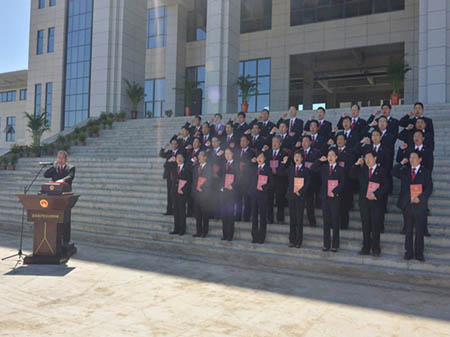 16日上午,房县人民法院新审判大楼前,全院首批38名入额法官,在领誓人院党组书记、代院长王俊卿的带领下做出庄严宣誓。据悉,县人民法院按照上级司法体制改革方案要求,从2015年11月开始进行首批入额法官的遴选工作。经过申报、考试、考核,并经省法官遴选委员会审核批准、公示,全院38名法官遴选为首批入额法官。 (何为 摄)