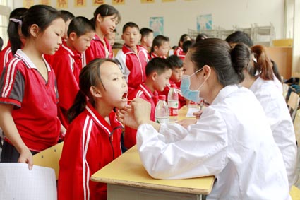 19日,县疾控中心组织县医院和中医院医务人员为县实验小学学生做健康体检。为提高全县中小学生健康水平,及时准确掌握学生体质健康发展动态,日前,我县中小学生健康体检工作启动。承担学生体检的县疾控中心和各乡镇卫生院,将对每位学生和各学生群体的体检数据进行统计分析与评价,出具体检报告,提出健康指导意见,帮助建立学生体质健康管理档案。各学校对学生的健康状况进行分析汇总,并将体检结果及时反馈给每位学生。据悉,在校学生将每年进行一次常规健康体检。(高书文 邓发基 赵培羽 摄)