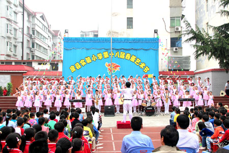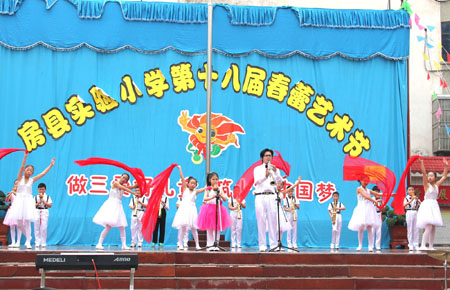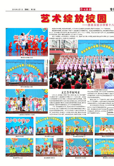 循着期待的眼眸,房县实验小学第十八届春蕾艺术节翩跹而来。宝蓝色的幕幔缓缓开启,满校园都是鲜艳的故事。万紫千红的舞台上,孩子尽情展示已经纯熟的才艺:看,书画手工上,艺术的魅力在这里闪光;瞧,阳光体育中,放飞一个又一个梦想。你在火红队旗下庄严入队,我在轻歌曼舞中激情演奏,她在口语竞赛中纵声吟唱……所有这些汇成了庆祝节日的协奏曲,在每一颗纯洁晶莹的心灵上留下久久回响。