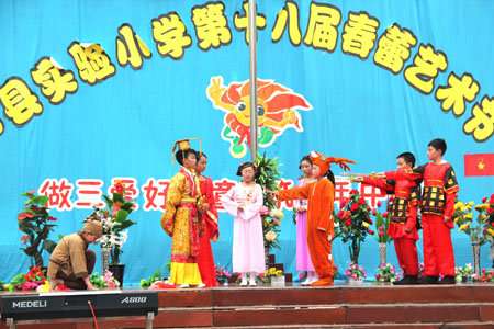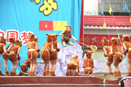 5月31日,县实验小学举行“做三爱好儿童,筑少年中国梦”为主题的“第十八届春蕾艺术节暨庆‘六一’文艺汇演”。活动在大合唱《祖国不会忘记 》《把心儿种在春天里》中拉开帷幕。具有民族风格的舞蹈《草原小红花 》《永远的映山红》,活学活用的课本剧《九色鹿》《猴子捞月》,自编自演的情景剧《七彩娃》,器乐合奏《星语心愿》等节目精彩纷呈,台下不时响起阵阵掌声。