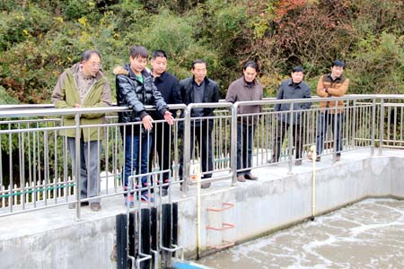 市局总工王子捷(左一)、副县长姚峰(左三)检查污水处理厂运行情况