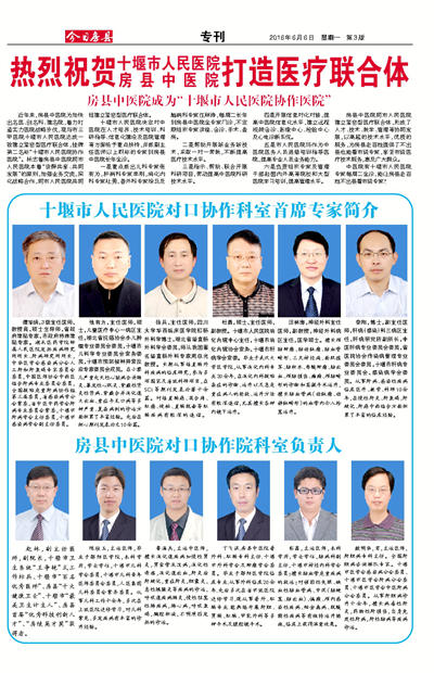 十堰市人民医院决定对中医院在人才培养、技术培训、科研指导、信息化建设及医院管理等方面给予重点扶持,并派副主任医师以上职称的专家到房县中医院长年坐诊。
