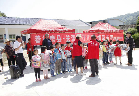 东河村小学现有学生88名,70%为留守儿童,学校体育设施也比较落后,房县大爱义工联合会了解到这个情况后,决定开展爱心活动。联合会近百名志愿者捐赠近5000元,为该校购买41英寸彩色电视机一台,简易体育活动器材、儿童玩具、儿童衣物、学习用具一批。在捐赠结束后,志愿者们还与在校学生开展了“你比我猜成语接龙”等互动游戏活动,使留守儿童度过了一个快乐的周末。参加活动的20多名义工志愿者,还与部分父母长年在外务工的儿童结成了“爱心爸爸妈妈”对子,“大手拉小手”,为他们带去关爱,使他们健康快乐成长。