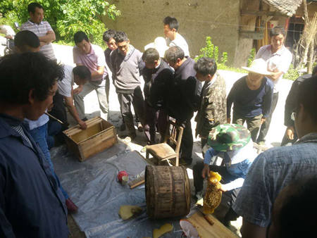 5日,在九道乡产业扶贫响应沟村蜂箱发放仪式现场,九道乡神农顶农民专业合作社与响应沟村60余养蜂大户签订了神农小蜜蜂产、购、销协议,当场发放蜂箱200个,合作社专业技术人员不仅进行了现场示范,还将实行全程跟踪式服务,确保神农小蜜蜂产业成为九道乡贫困户脱贫致富的好帮手。(孟柱 邢伟 摄)