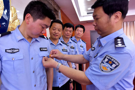 17日上午,县公安局政工党支部全体8名党员在当月的党课上,把佩戴党员徽章、交党费作为党课的重要内容,这是该局在全体党员民警中开展“戴党徽、亮身份、做表率、树形象”活动的一个缩影。活动中,全局200多名党员民警通过重温入党誓词、唱《国歌》、学党纪,增强自律和责任意识。图为局领导为党员佩戴党员徽章。 (魏世银 摄)