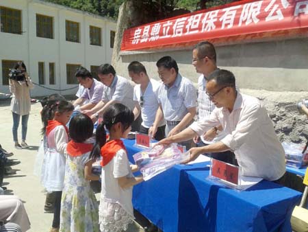 17日,县财政局驻大木厂镇精准扶贫工作队组织房县鼎立信担保有限公司21名员工来到安羊沟小学开展结对帮扶活动。公司董事长李明波代表公司捐款3万元、50个书包、50个文具盒、20个水杯等学习用具;李明波个人捐现金5000元。员工认领18名留守儿童为爱心子女结对帮扶对象 。(张越 张新平 摄)