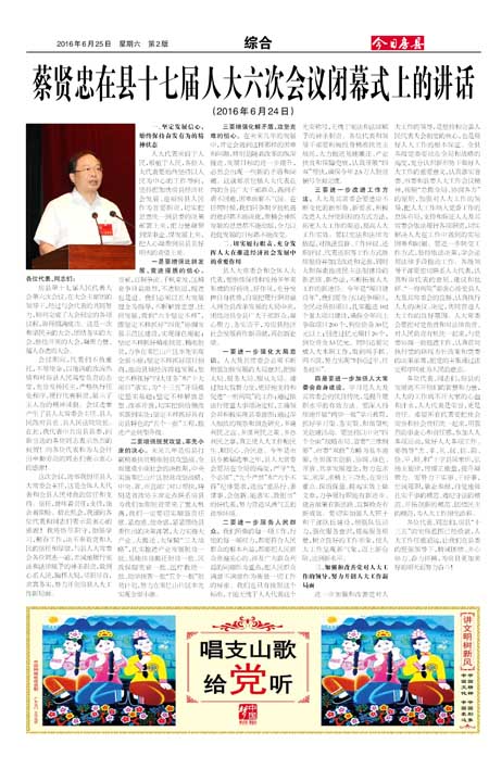 二要进一步服务人民群众。我们所做的每一项工作,行使的每一项权力,都要符合人民群众的根本利益,都要把人民群众普遍关心的、涉及广大群众利益的问题作为重点,把人民群众满意不满意作为衡量一切工作的标准。我们也只有按照这个标准,才能无愧于人大代表这个光荣称号,无愧于宪法和法律赋予的神圣职责。各位代表和领导干部要积极投身精准扶贫主战场,大力推进易地搬迁、产业扶贫和保障兜底,认真开展“四双”帮扶,确保今年2.5万人脱贫销号全面完成。