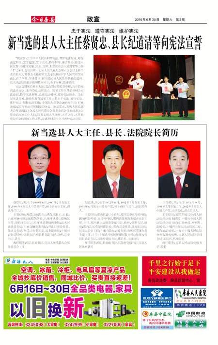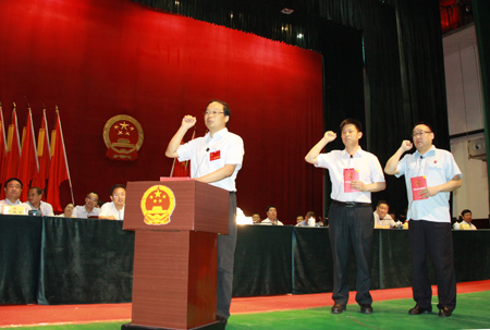 “我宣誓:忠于中华人民共和国宪法,维护宪法权威,履行法定职责,忠于祖国,忠于人民,恪尽职守、廉洁奉公,接受人民监督,为建设富强、民主、文明、和谐的社会主义国家努力奋斗!”,24日,在房县第十七届人民代表大会第六次会议上新当选的县人大常委会主任蔡贤忠左手抚按《中华人民共和国宪法》,右手举拳,领诵誓词;新当选的县人民政府县长纪道清、县人民法院院长王俊卿整齐站立,右手举拳,跟诵誓词。
