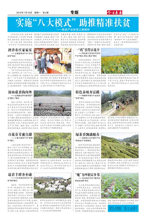 去年以来,县委、县政府秉承“精准扶贫、产业支撑”的发展理念,抢抓省委、省政府实施“四个一批”工程,市委、市政府实施“四个百万”工程和精准扶贫支持发展产业的政策机遇,依托资源禀赋和产业基础,围绕“三年总体脱贫、五年同步小康,奋力走在全省精准扶贫前列”的奋斗目标,打绿色牌、走生态路,大力发展食用菌、核桃、中药材、山羊、茶叶、蔬菜、大鲵、烟叶八大特色产业,综合施策,着力开展光伏扶贫、旅游扶贫、电商扶贫、劳务扶贫,激发市场主体活力,增强贫困户内生动力和贫困户造血功能,总结探索出了以市场主体带动为重点的食用菌产业“园区+”、黄酒产业“统分经营”、中药材产业“租金+薪金+股金”、山羊产业“四包”、产业扶贫“双带”、茶叶产业“租包结合”、魔芋“借种还种”等“八大扶贫模式”,走出了一条具有鲜明特色的产业扶贫之路。