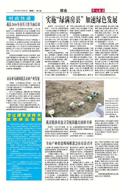 积极创建森林城市。围绕“老城添绿、新城植绿、显山透绿、河道满绿”思路,坚持县城、森林、园林三者融合,城区、近郊、远郊三位一体,林网、路网、水网三网合一,乔木、灌木、地被植物“三头并举”,打造“一城两带”、“多廊多点”的森林城市格局。县城绿化覆盖率达到45.6%、人均公园绿地面积11.3平方米。
