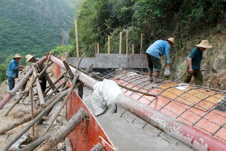 24日,城关镇的农民正在抢修“三八” 万米长渠三海段水毁渠道,图为加固渠道挑流式工程。入夏以来,我县水利部门集中人力、物力,抢修水毁渠道,除险加固水库、堤防工程,保障群众生命财产安全。目前,完成抢修病险河堤21公里,渠道51公里,加固除险小型水库29座。