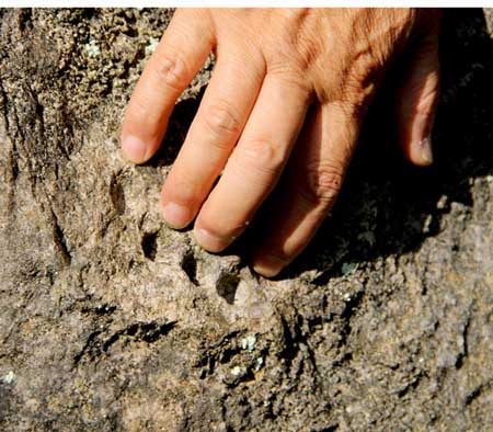 “四指山”名称源于留在山石上的四个手指印,相传真武大帝修仙得道后,坐在此山休息一晚,第二天却发现此山下陷三尺三寸,于是就用手将山体托起恢复原状。因用力过大,在山石上留下了真武大帝四个手指印记。(刘中华 周开华 摄)
